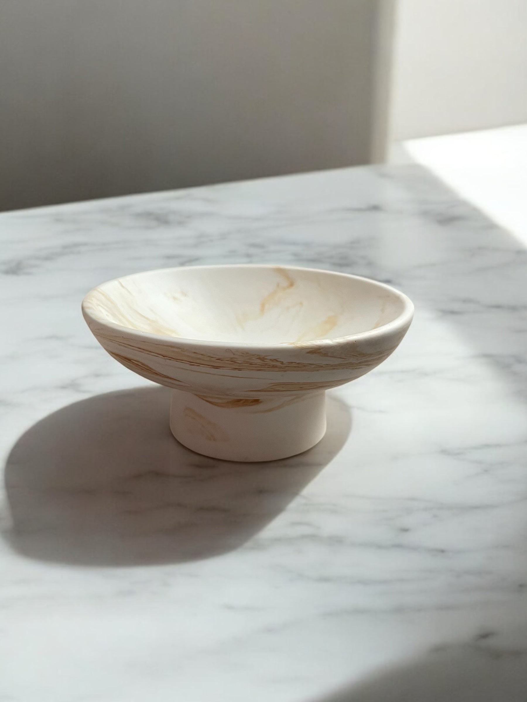 Schlicht, elegant und zeitlos – „Ivory“ verkörpert pure Zurückhaltung und natürliche Schönheit. Die zarten, marmorierten Maserungen in Creme- und Beigetönen erinnern an warmen Sand und sanftes Licht. Jede Schale wird von Hand aus Jesin gegossen und ist damit ein Unikat.